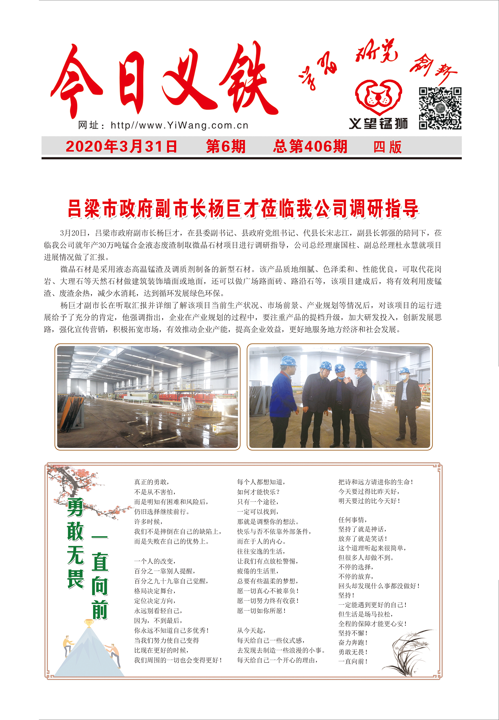 3月20日,呂梁市政府副市長楊巨才,在縣委副書記、縣政府黨組書記、代縣長宋志江,副縣長郭強的陪同下,蒞臨我公司就年產(chǎn)30萬噸錳合金液態(tài)廢渣制取微晶石材項目進(jìn)行調(diào)研指導(dǎo),公司總經(jīng)理康國柱、副總經(jīng)理杜永慧就項目進(jìn)展情況做了匯報。