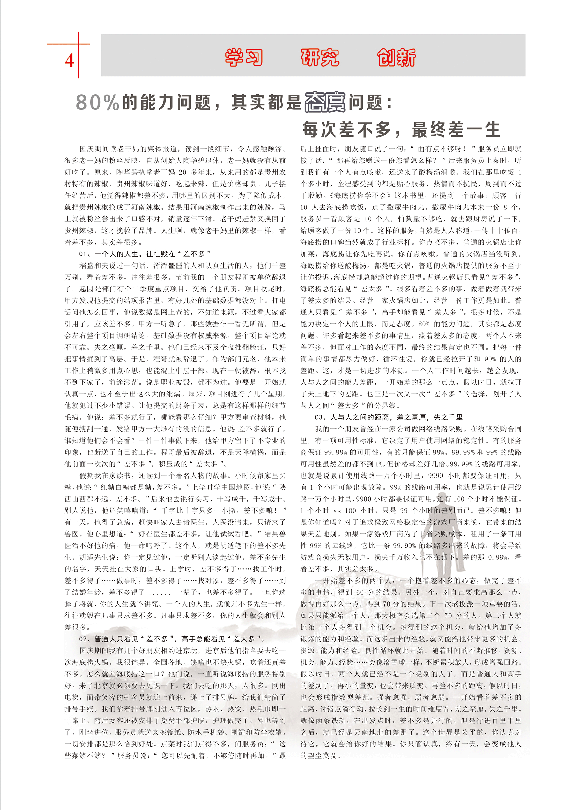 我們每個人都有一份屬于自己的工作,雖然大家的工作崗位不同,但都一樣重要。工作沒有高低貴賤之分,只要做好了、做到精致,每個人都可以在自己的工作崗位上出彩,讓自己在愛崗敬業(yè)中獲得不凡的價值。
