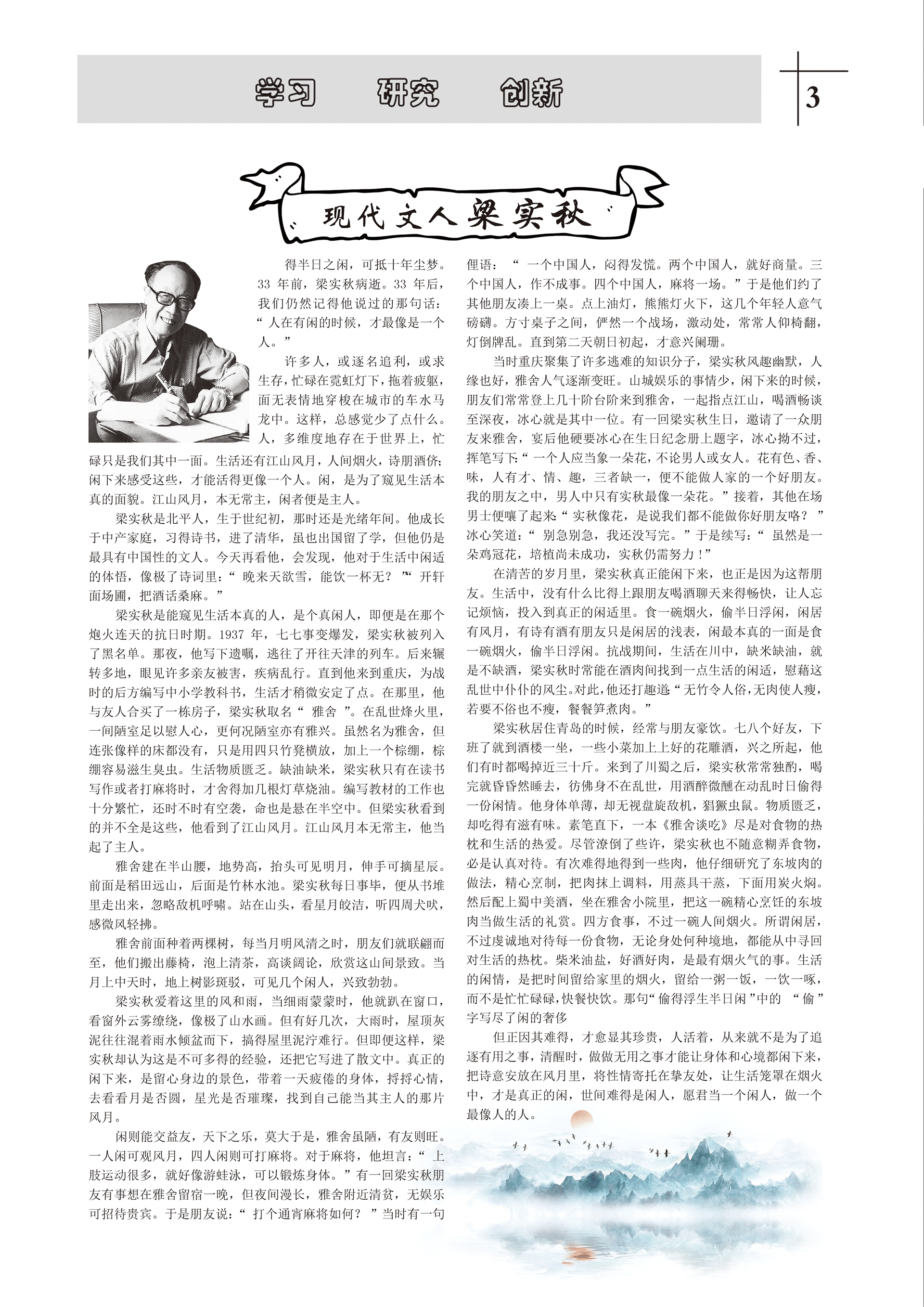 得半日之閑,可抵十年塵夢。33年前,梁實(shí)秋病逝。33年后,我們?nèi)匀挥浀盟f過的那句話:“人在有閑的時候,才最像是一個人?!?